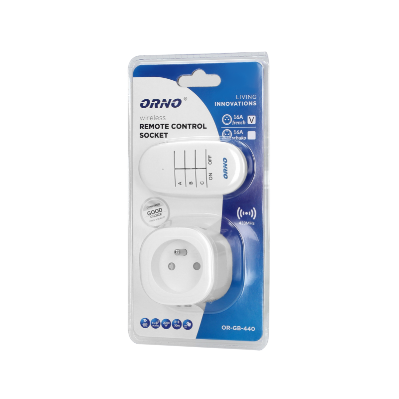 Urządzenie OR-GB-440 marki ORNO przeznaczone do bezprzewodowego włączania i wyłączania urządzeń elektrycznych wewnątrz pomieszczeń m.in. lampy, TV, wentylatory, klimatyzatory itp. Włączanie i wyłączanie realizowane jest za pomocą pilota (nadajnika). Learning system (automatyczne logowanie).