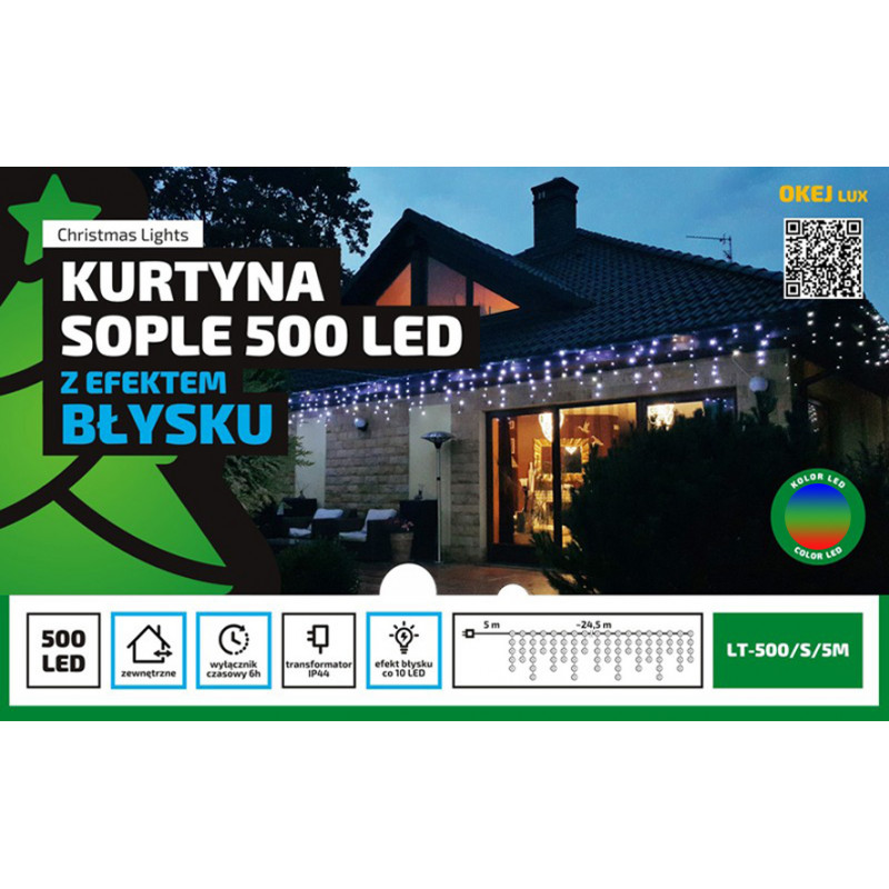 Kurtyna sople lampki świąteczne 500LED multlor + flash 24,5m LT-500/S/5M OKEJ LUXiko