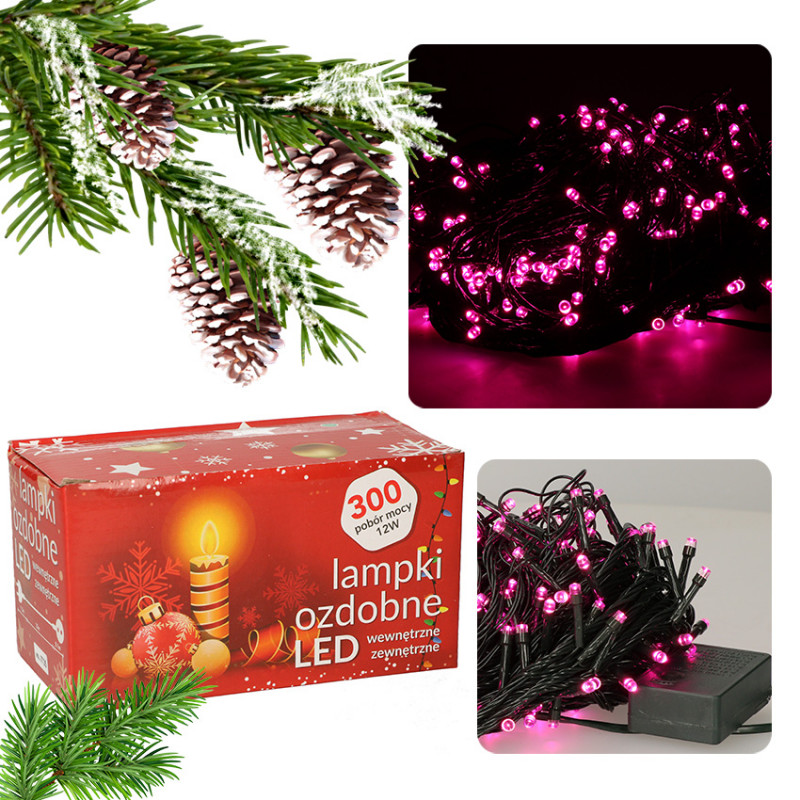 Lampki choinkowe 300LED o różowej barwie światła wprowadzają wyjątkowy nastrój do każdej dekoracji. Wyraziste światło idealnie podkreśla świąteczny klimat zarówno w domu, jak i na zewnątrz. Doskonały wybór dla osób szukających nietuzinkowych rozwiązań oświetleniowych.