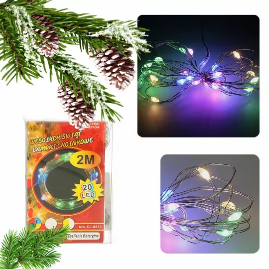 Lampki choinkowe na druciku z 20 diodami LED to idealny sposób na delikatne i nastrojowe oświetlenie. Emitują kolorowe światło, tworząc przytulną atmosferę w każdym wnętrzu. Doskonale sprawdzą się do dekoracji świątecznych, stołów czy girland.