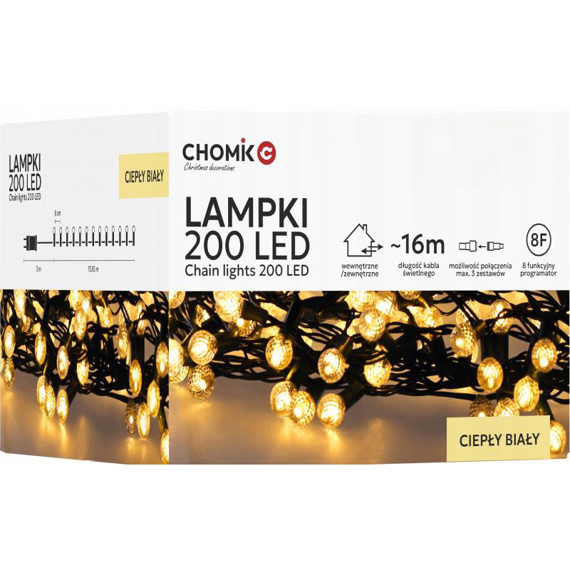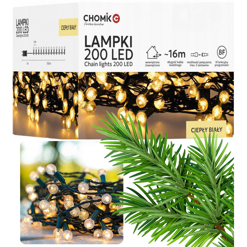 Lampki choinkowe CHERRY BALL 200 LED w ciepłej barwie światła to doskonały wybór dla tych, którzy szukają połączenia funkcjonalności i estetyki. Subtelne kulki LED tworzą przytulną, magiczną atmosferę, idealną na święta i inne okazje. Dzięki możliwości zastosowania zarówno wewnątrz, jak i na zewnątrz, dekoracja doskonale sprawdzi się w domu, ogrodzie czy na tarasie.