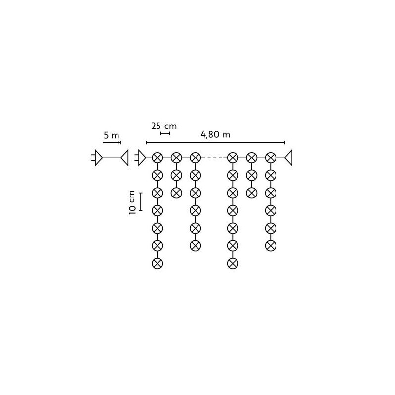 Długość dekoracji wynosi 4,8m, co zapewnia łatwą instalację na dachach, balustradach, balkonach, wokół drzew, murów, czy pergoli. Przewód jest dyskretny i nie przeszkadza w aranżacji przestrzeni. Ponadto lampki posiadają stopień IP44, co oznacza, że są odporne na wilgoć i mogą być używane na zewnątrz bez obaw o uszkodzenia.