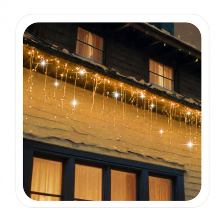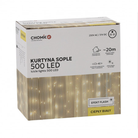 Kurtyna świetlna LED9898 z 500 diodami LED w kolorze ciepłym białym + zimny flash tworzy efektowne, dynamiczne oświetlenie, idealne do dekoracji świątecznych. Dzięki różnym długościom sopli (30/70/40/60 cm) i 100 soplom, kurtyna prezentuje się spektakularnie zarówno w ogrodzie, jak i wewnątrz pomieszczeń.
