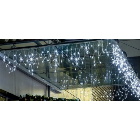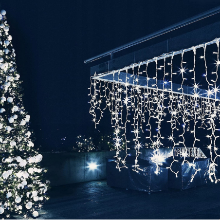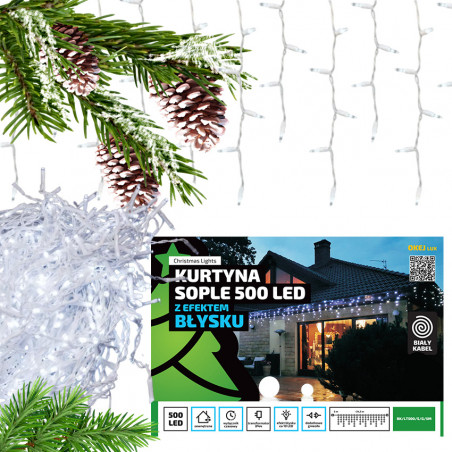 Kurtyna LED z 500 diodami w zimnej białej barwie z efektem flash co 10 diod tworzy spektakularny, dynamiczny efekt świetlny. Idealna do dekoracji domu, ogrodu, balkonu czy tarasu podczas świąt i innych okazji.