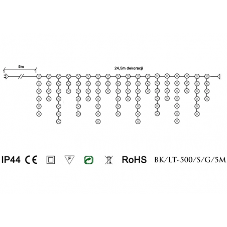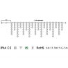 Kurtyna posiada transformator IP44 oraz wyłącznik czasowy, co umożliwia automatyczne sterowanie światłem i bezpieczne użytkowanie na zewnątrz. Długość przewodu zasilającego to 5 m, a dekoracja ma 24,5 m długości świecącej.