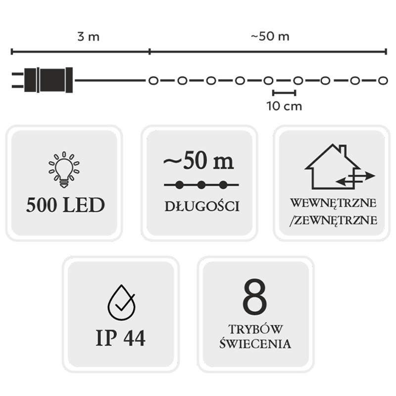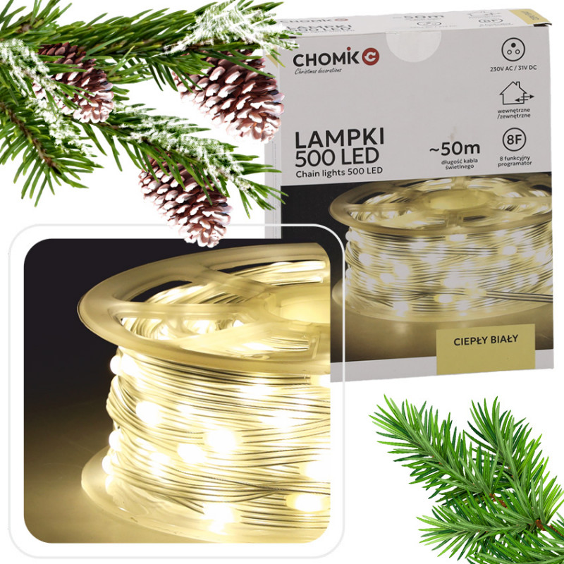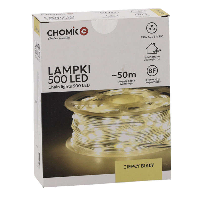 Lampki CHOMIK LED0115 to 500 diod LED w ciepłej białej barwie, umieszczonych na 50 metrach przewodu. Dzięki subtelnej, złocistej poświacie tworzą przytulny i świąteczny klimat w domu, ogrodzie lub na tarasie. Transparentna izolacja sprawia, że przewód jest niemal niewidoczny, a światło wygląda wyjątkowo elegancko.