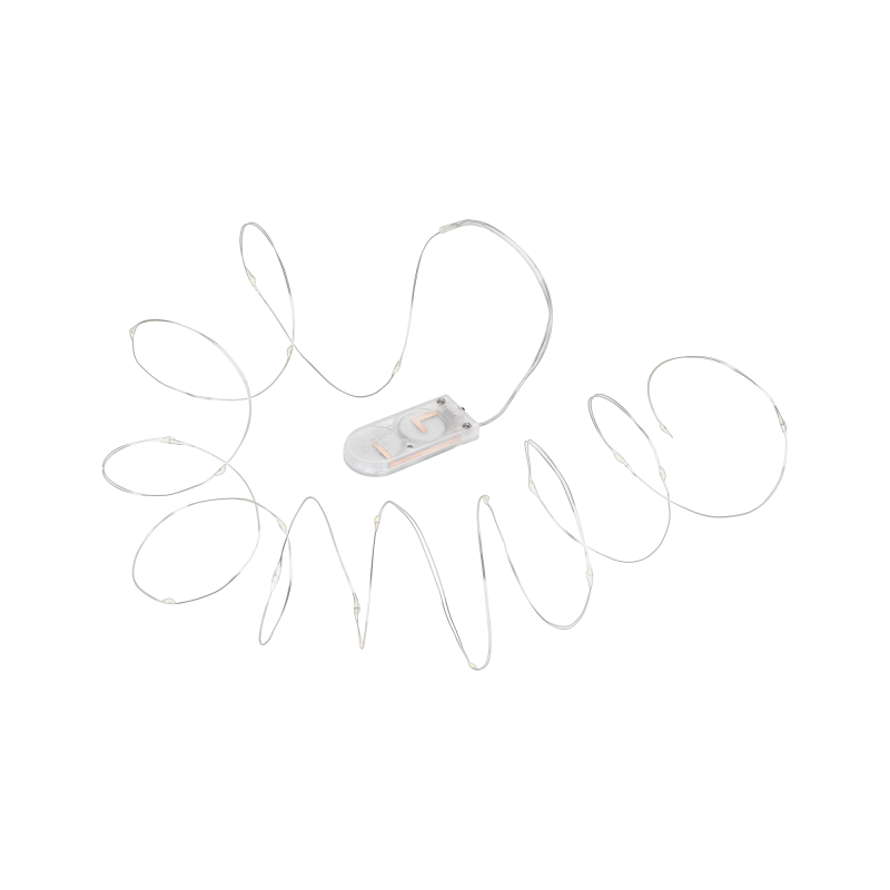 Zestaw zawiera 20 mini LED-ów, które są rozmieszczone na sznurze o długości 1,9 metra. Diody są umieszczone w odstępach co 10 centymetrów, co zapewnia równomierny rozkład światła na całej długości sznura. Światełka emitują stałe, zimne białe światło, które tworzy delikatny i magiczny efekt, idealny do tworzenia nastrojowej atmosfery. Długość kabla od sterownika do pierwszej żarówki wynosi 10 centymetrów, co pozwala na łatwe i estetyczne rozmieszczenie lampek w dowolnym miejscu. Lampki LED na druciku Rebel są zasilane dwoma bateriami typu CR2032, co znacznie zwiększa ich mobilność i elastyczność w użytkowaniu. Dzięki zasilaniu bateryjnemu nie jesteśmy ograniczeni dostępem do gniazdka elektrycznego, co pozwala na kreatywne wykorzystanie światełek w różnych miejscach, zarówno wewnątrz domu, jak i w jego otoczeniu. Długi czas działania na jednym zestawie baterii umożliwia cieszenie się pięknym światłem przez wiele dni bez konieczności częstego wymieniania baterii.