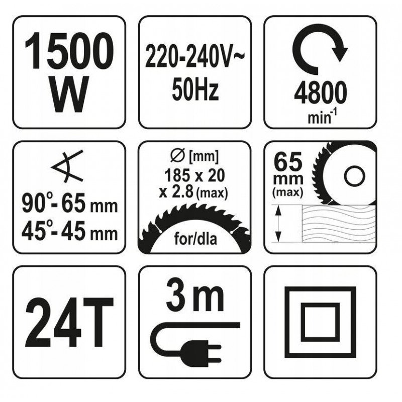 - w zestawie tarcza tnąca o średnicy 185 mm z 24 zębami, ze standardowym otworem mocującym o średnicy 20 mm