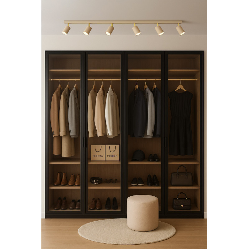 Model K-5824 to metalowa listwa o długości 115 cm, na której zamontowano sześć reflektorów z gniazdami GU10 do 10W LED każdy. Dzięki możliwości podziału na dwa włączniki (3+3) użytkownik może dowolnie sterować intensywnością światła, dostosowując je do sytuacji. Lampa posiada stopień ochrony IP20, co czyni ją idealnym wyborem do suchych pomieszczeń, takich jak kuchnia, jadalnia, salon czy korytarz. Jej uniwersalny design i wysoka funkcjonalność sprawiają, że sprawdzi się zarówno w nowoczesnych, jak i bardziej klasycznych aranżacjach.