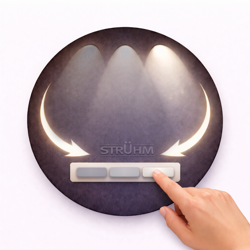 Lampa oferuje regulację mocy 12 W / 18 W / 24 W, co pozwala dostosować intensywność oświetlenia do wielkości pomieszczenia. Dodatkowo trzystopniowa regulacja temperatury barwowej CCT umożliwia wybór światła ciepłego (3000 K), neutralnego (4300 K) lub zimnego (6500 K). Wbudowane źródło SMD LED zapewnia strumień świetlny oprawy do 2340 lm, gwarantując skuteczne i równomierne oświetlenie.