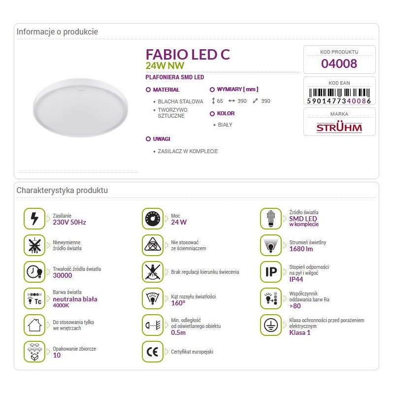 FABIO to doskonałe rozwiązanie dla każdej kuchni, łazienki, pokoju i przedpokoju. Pomieszczeniu, w którym zostanie zamontowany, nada blasku, świeżości, klasyki, elegancji i nowoczesności. Stopień ochrony produktu to IP44, a żywotność zamontowanych energooszczędnych diod wynosi około 30000h.