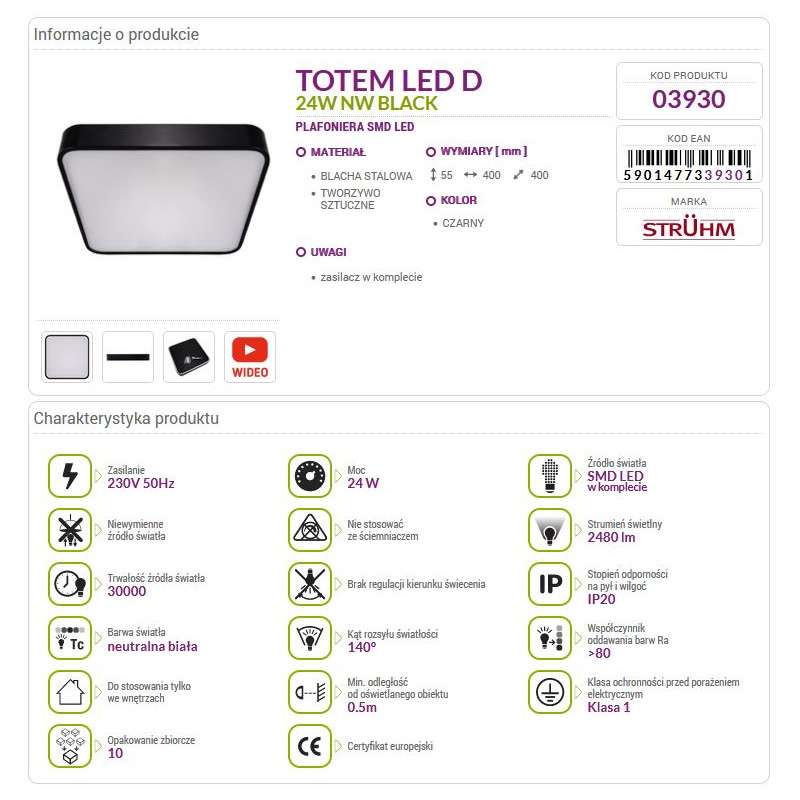Cechą charakterystyczną serii plafonów TOTEM D jest wysoka jakość wykonania. Podstawa plafonu wykonana jest z tworzywa sztucznego oraz stali. Klosz wspaniale rozprasza światło, dzięki czemu lampa świeci równomiernie na całej powierzchni. Konstrukcja plafonu pozwala na montaż naścienny lub sufitowy. Wewnątrz zastosowano źródło światła LED 24W, które pozwoli zaoszczędzić do 90% energii elektrycznej.