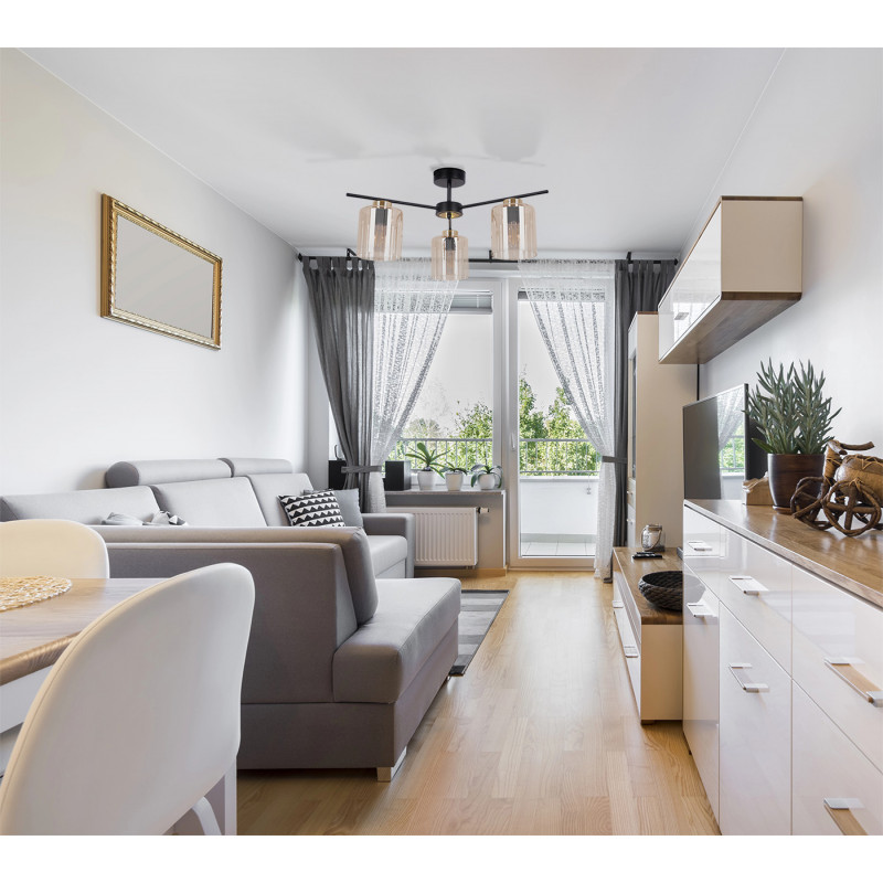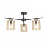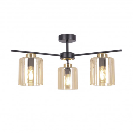 Lampa sufitowa K-5521 z serii AURELIA to propozycja dla osób ceniących stylowe i funkcjonalne oświetlenie. Czarna metalowa konstrukcja z subtelnymi złotymi akcentami nadaje wnętrzu elegancji i charakteru. Bursztynowe, szklane klosze w połączeniu z geometryczną formą tworzą wyjątkowy efekt wizualny.