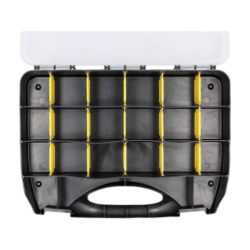 Organizer Toya model Domino to praktyczne rozwiązanie do przechowywania drobnych przedmiotów w różnych miejscach, takich jak dom, garaż czy warsztat. Wykonany z wytrzymałego tworzywa sztucznego PVC, zapewnia solidność i trwałość użytkowania. Jego wymiary 360x270 mm pozwalają na kompaktowe przechowywanie, jednocześnie oferując wystarczającą przestrzeń na niewielkie elementy, takie jak części zamiennych, narzędzia czy drobne elementy złączne.