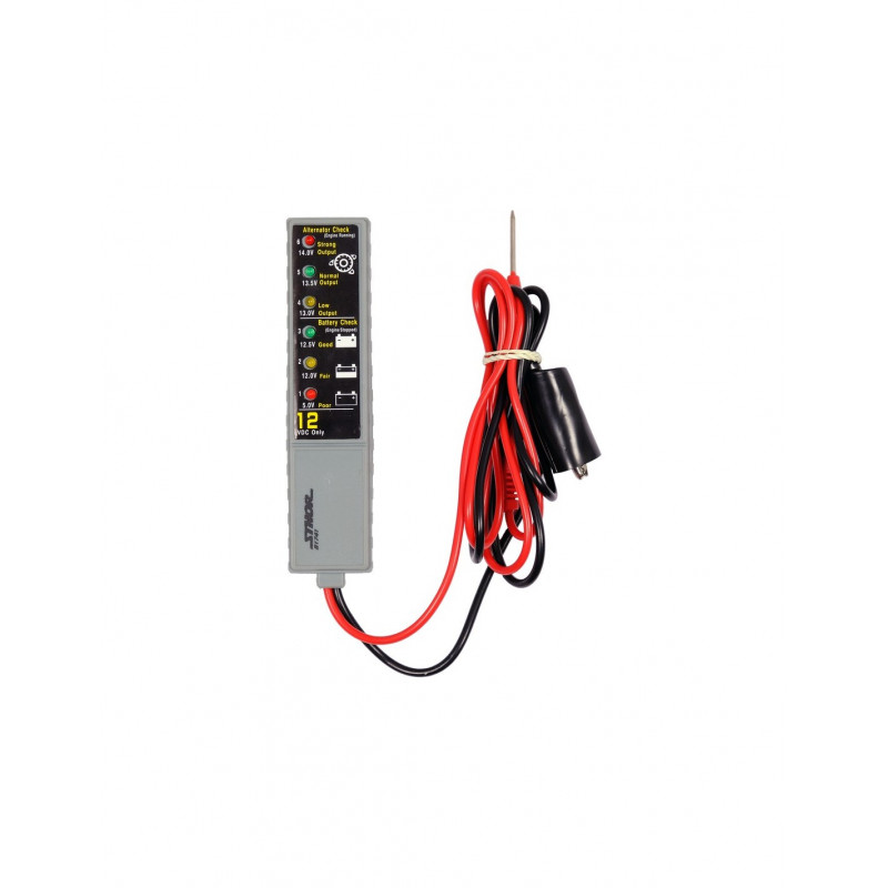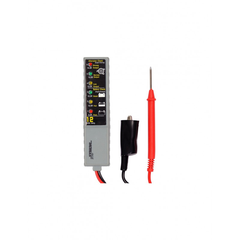 Tester alternatora i akumulatora marki Sthor, o symbolu 81741, to niezbędne narzędzie do diagnostyki pojazdów oraz systemów zasilania. Zaprojektowany specjalnie do akumulatorów 12 V, tester umożliwia szybkie i dokładne sprawdzenie stanu naładowania akumulatora oraz kondycji alternatora poprzez odczyt parametrów za pomocą diodowych wskaźników. Główne zastosowania testera obejmują ocenę stanu naładowania oraz sprawności akumulatora kwasowo-ołowiowego. Dzięki wbudowanym kontrolkom diodowym użytkownik może szybko odczytać informacje na temat stanu naładowania oraz wyeksploatowania akumulatora, co jest kluczowe zarówno dla utrzymania optymalnej wydajności pojazdu, jak i zapewnienia niezawodności jego systemu zasilania.