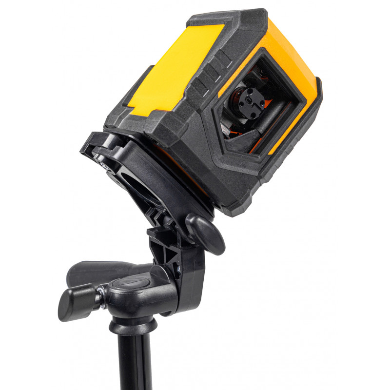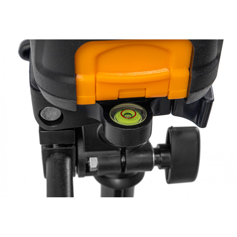 Urządzenie wyposażone jest również w tryb ręczny, który umożliwia zablokowanie linii. Ta funkcja pozwala na używanie poziomicy pod dowolnym kątem, co jest szczególnie przydatne w sytuacjach, gdy standardowe ustawienie poziome lub pionowe nie jest wystarczające. Dzięki trybowi ręcznemu można dostosować poziomicę do specyficznych wymagań danego zadania, co zwiększa jej wszechstronność i funkcjonalność. W zestawie z poziomicą znajduje się również trójnóg o maksymalnej wysokości 0,65 m. Trójnóg ten umożliwia stabilne ustawienie poziomicy na odpowiedniej wysokości, co z kolei pozwala na pomiar w odległości do 10 metrów od miejsca pomiaru. Taki dodatek znacząco poprawia wygodę pracy, umożliwiając precyzyjne pomiary w różnych warunkach roboczych.