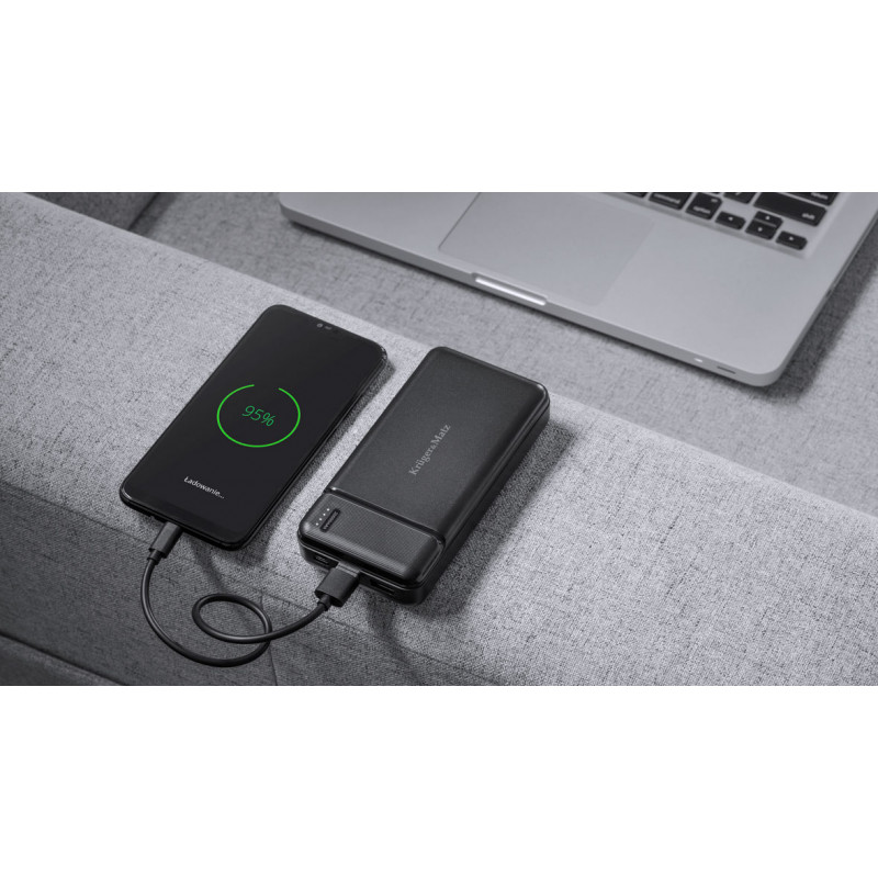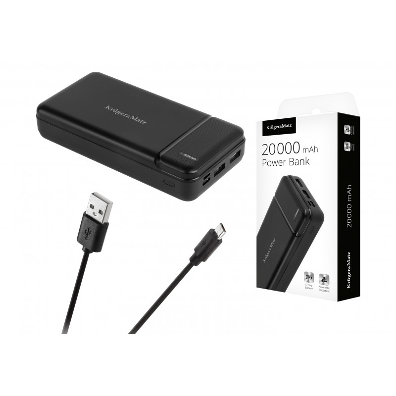 Powerbank Kruger&Matz posiada szereg zabezpieczeń: przed przepięciem, przeciążeniem, przeładowaniem, głębokim rozładowaniem, a stan jego baterii możesz kontrolować dzięki czterem diodom umieszczonym na czarnej, solidnej obudowie. Wejścia USB typu C i micro USB pozwalają na komfortowe ładowanie urządzenia za pomocą wybranego typu kabla.