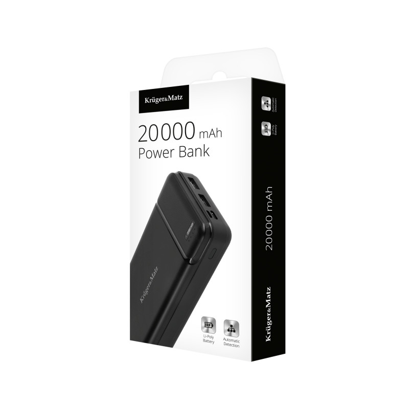 Jeśli Twoja wymagająca praca w terenie sprawia, że w ciągu dnia potrafisz kilka razy ładować swojego smartfona czy tablet to znak, że potrzebujesz naprawdę dużego powerbanka! Wybierz Kruger&Matz KM0906 z ogniwem litowo-polimerowym o pojemności 20 000 mAh, która pozwoli wielokrotnie naładować Twój smartfon, tablet czy aparat. Dzięki dwóm portom USB i pojemnym powerbankiem Kruger&Matz możesz naładować jednocześnie dwa urządzenia. Wystarczy, że podłączysz kabel, a urządzenie samo wykryje połączenie i rozpocznie pracę.