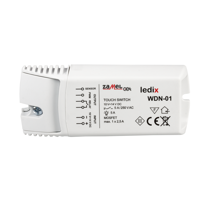 Urządzenie zasilane jest napięciem 10÷14 V DC, co zapewnia mu dużą elastyczność w zastosowaniach. WDN-01 jest wyposażony w czujnik o długości przewodu 1,5 m, który jest kluczowym elementem łączącym wyłącznik z przewodzącymi elementami opraw oświetleniowych. Dzięki temu możliwe jest precyzyjne sterowanie oświetleniem w sposób dotykowy. Wyłącznik oferuje dwa główne typy wyjść, które znacząco rozszerzają jego funkcjonalność. Wyjście PWM (Pulse Width Modulation) umożliwia nie tylko podstawowe funkcje załączania i wyłączania, ale także pozwala na rozjaśnianie i ściemnianie oświetlenia. Jest to szczególnie przydatne w przypadku oświetlenia diodowego, które wymaga precyzyjnej regulacji intensywności światła. Wyjście PWM zapewnia płynne przejścia między różnymi poziomami jasności, co wpływa na komfort użytkowania i estetykę wnętrz.