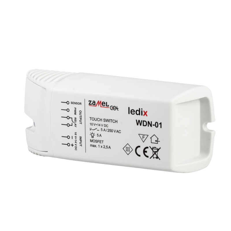 Dodatkowo, WDN-01 posiada wyjście przekaźnikowe beznapięciowe typu NO (normalnie otwarte) o maksymalnej obciążalności 5 A. To wyjście jest przeznaczone do załączania lub wyłączania dowolnych odbiorników, takich jak klasyczne żarówki czy halogeny. Wyjście przekaźnikowe pracuje równolegle z wyjściem PWM, co daje użytkownikom elastyczność w zarządzaniu różnymi rodzajami oświetlenia za pomocą jednego urządzenia. Wyłącznik WDN-01 charakteryzuje się niewielkimi rozmiarami, co sprawia, że jest dyskretny i łatwy do zamontowania w różnych miejscach. Jest przeznaczony do montażu natynkowego, co oznacza, że można go zainstalować bezpośrednio na powierzchni ściany lub innych materiałach, takich jak drewno, płyty meblowe, czy gipsowo-kartonowe. Dzięki swojej konstrukcji, urządzenie jest odpowiednie do sterowania oświetleniem w meblach kuchennych i łazienkowych, gdzie estetyka i funkcjonalność są równie ważne.