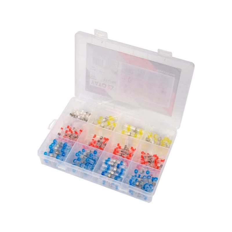 Zestaw przezroczystych rurek termokurczliwych YT-81460 z pierścieniem cyny na środku oraz dwoma pierścieniami kleju termicznego po bokach, który dodatkowo uszczelnia połączenie.