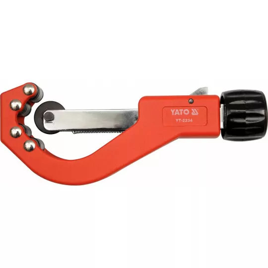 Posiada 4 stalowe rolki z obustronnym podtoczeniem do cięcia obwiedniowego. Nóż z utwardzanej stali. Mechanizm szybkiego nastawiania średnicy rurki. Obcinak do rur z gratownikiem przeznaczony jest do pracy w zakresie średnic od 14 do 63 mm (1/2"-5/2"). Tnie rury miedziane, aluminiowe i wykonane z tworzyw sztucznych. Polecany do użytku zawodowego w serwisie hydraulicznym i budownictwie. Korpus wykonana z aluminium