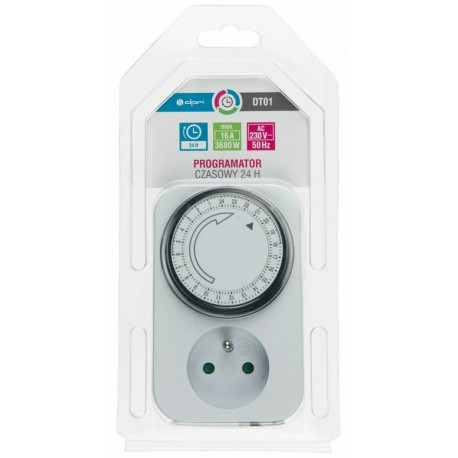 Programator czasowy elektroniczny pozwala na budowanie grup przekaźników. W przypadku podłączenia zbyt dużej ilości przycisków podświetlanych może dochodzić do samoistnego załączania oświetlenia lub załączenia oświetlenia na stałe. Sterownik zasilany jest napięciem prądowym o maksymalnej mocy 230V. Urządzenie posiada zarówno szybki sposób montażu jak i demontażu w dowolnej chwili a to dzięki jego budowie. Wtyk programatora jest bezpośrednio montowany w gnieździe zasilającym, przy tym nie zajmuje go bezpośrednio. Dostęp do gniazda jest dalej dostępny.