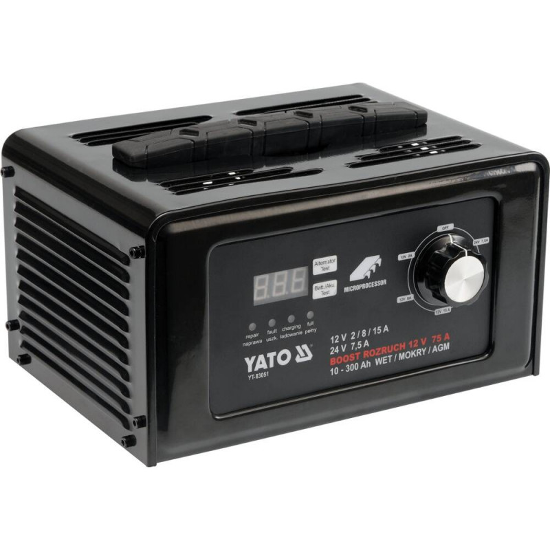 Prostownik Yato YT-83051 oferuje napięcie ładowania na poziomie 12V lub 24V d.c., a prąd ładowania wynosi odpowiednio 7,5A przy 24V. Urządzenie zasilane jest napięciem 230V a.c. o częstotliwości 50 Hz, co sprawia, że jest kompatybilne z większością standardowych instalacji elektrycznych. Maksymalna pojemność ładowanego akumulatora to imponujące 300 Ah, a zakres pojemności obsługiwanych akumulatorów wynosi od 10 do 300 Ah. Dzięki temu prostownik ten jest wszechstronny i może być używany do ładowania różnych typów akumulatorów, takich jak mokre, żelowe oraz AGM.