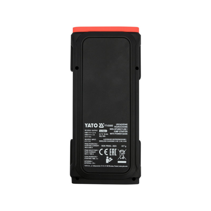 Urządzenie rozruchowe Yato YT-83085 to wszechstronny power bank o dużej pojemności, zaprojektowany z myślą o awaryjnym uruchamianiu różnych pojazdów oraz zasilaniu urządzeń przenośnych. Wyposażony w funkcję ładowania indukcyjnego oraz wyświetlacz LCD, zapewnia wygodę użytkowania i łatwą obsługę. Dzięki solidnej konstrukcji i wysokiej wydajności, urządzenie jest niezastąpione w nagłych przypadkach i codziennym użytkowaniu.