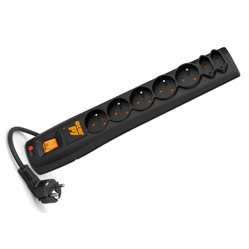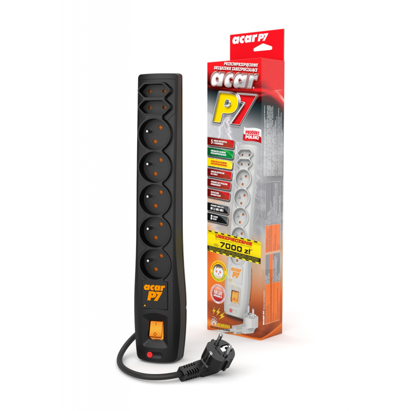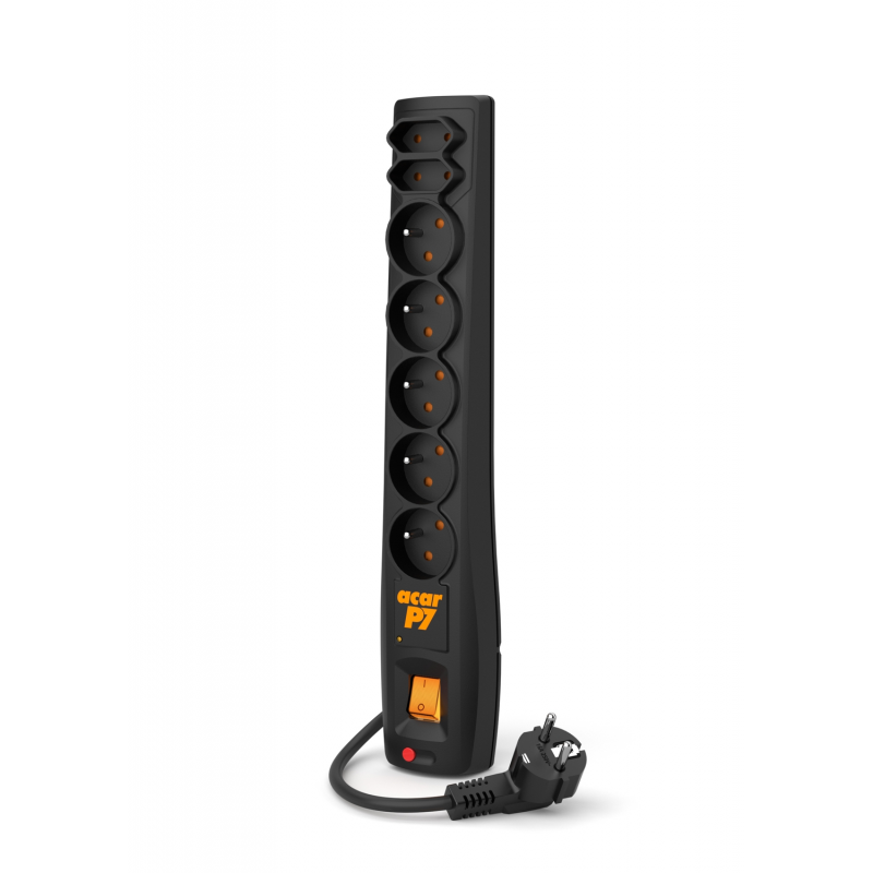 acar P7 to model z siedmioma zabezpieczonymi gniazdami sieciowymi 230V, w tym 5 z uziemieniem i 2 płaskimi bez uziemienia. Ilość ta, w większości zastosowań jest wystarczająca, a stosunkowo niewielkie rozmiary pozwalają na swobodne umieszczenie go nawet na biurku.