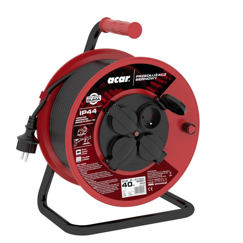 Solidna rama nośna przedłużacza zapewnia stabilność i wygodę podczas rozwijania oraz zwijania przewodu. Przedłużacz wyposażony jest w cztery osłonięte bryzgoszczelnymi klapkami IP44 gniazda sieciowe, które są dodatkowo zabezpieczone stykami oraz przesłonami ochronnymi. Taki design zapewnia bezpieczeństwo użytkowania, chroniąc zarówno gniazda, jak i podłączone urządzenia przed działaniem wody i zanieczyszczeń. Dla dodatkowego bezpieczeństwa, przedłużacz bębnowy ACAR jest wyposażony w automatyczny bezpiecznik w bryzgoszczelnej osłonie IP44, który chroni przed skutkami przeciążenia i zwarcia. Klips do zaparkowania wtyczki ułatwia przechowywanie, zapobiegając przypadkowemu uszkodzeniu wtyczki i kabla, gdy przedłużacz nie jest używany.
