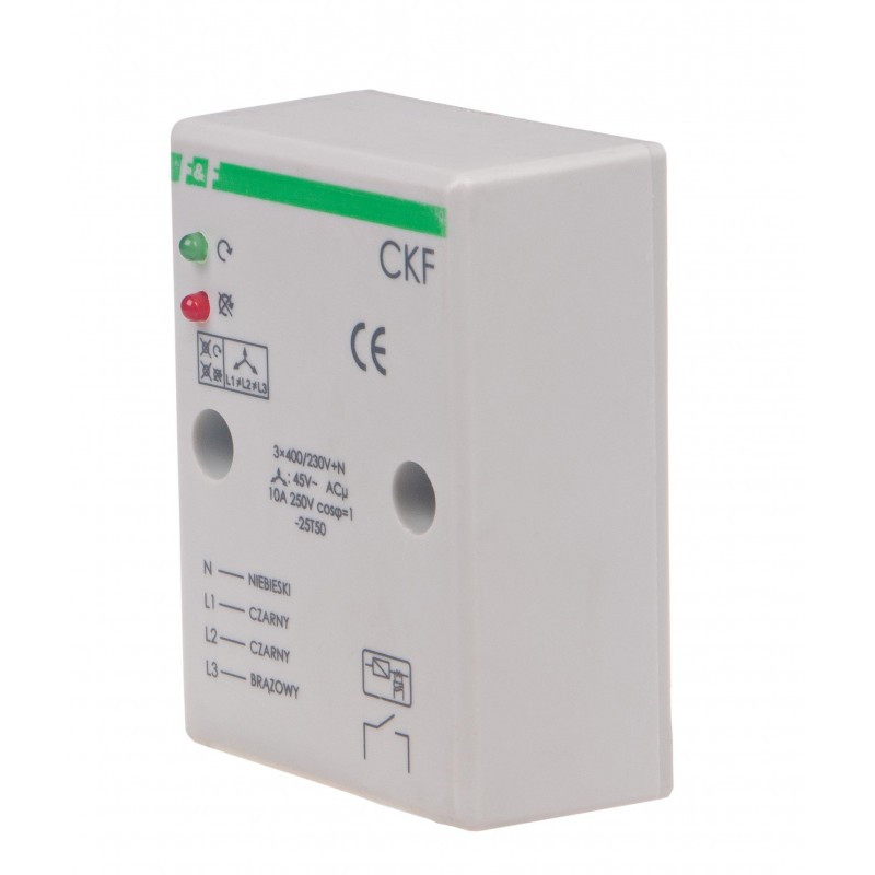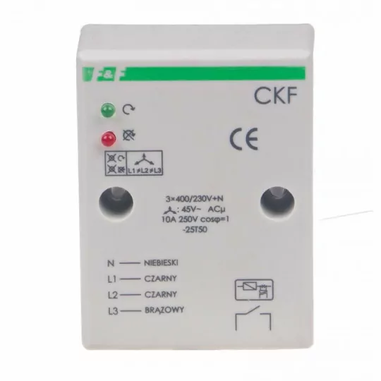 Przekaźnik kolejności, zaniku i asymetrii faz CKF F&F to urządzenie zaprojektowane z myślą o ochronie silników elektrycznych zasilanych z sieci trójfazowej. Jego głównym celem jest zapewnienie bezpieczeństwa silników w sytuacjach, które mogą prowadzić do ich uszkodzenia, takich jak zanik napięcia w jednej lub więcej fazach, oraz asymetria napięć między fazami. Czujnik CKF F&F działa na zasadzie monitorowania napięcia w każdej z faz i wykrywania ewentualnych nieprawidłowości. Jeśli wykryje zanik napięcia w co najmniej jednej fazie lub asymetrię napięciową między fazami, która przekracza ustalony próg zadziałania, automatycznie wyłącza silnik. Wyłączenie to następuje z opóźnieniem wynoszącym 4 sekundy, co ma na celu zapobieganie przypadkowemu odłączeniu silnika w przypadku chwilowych spadków napięcia, które mogą wystąpić np. podczas rozruchu lub przy dużych obciążeniach.
