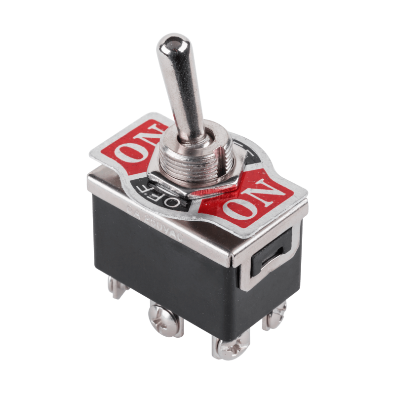 Przełącznik hebelkowy KN3-203 to zaawansowane urządzenie charakteryzujące się funkcjonalnością ON-OFF-ON, co oznacza, że może przełączać pomiędzy dwoma stanami włączonymi oraz jednym wyłączonym. Jest to rozwiązanie, które doskonale sprawdzi się w sytuacjach, gdzie konieczne jest sterowanie złożonymi obwodami elektrycznymi, wymagającymi więcej niż jednej funkcji przełączania.