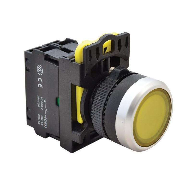 Jednym z kluczowych atutów tego przycisku jest podświetlenie, które zwiększa widoczność w ciemniejszych warunkach i poprawia ergonomię użytkowania. Żółty kolor przycisku nie tylko pełni funkcję sygnalizacyjną, ale również przyciąga uwagę, co jest istotne w aplikacjach wymagających wyraźnego oznaczenia lub ostrzeżenia. Samopowrotna funkcja przycisku zapewnia, że po naciśnięciu wraca on automatycznie do pierwotnej pozycji, co jest użyteczne w wielu aplikacjach wymagających czasowego aktywowania funkcji.