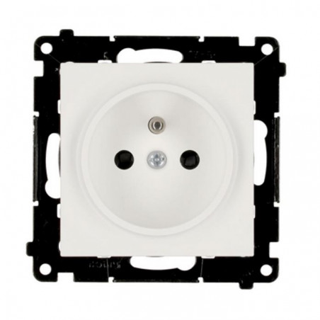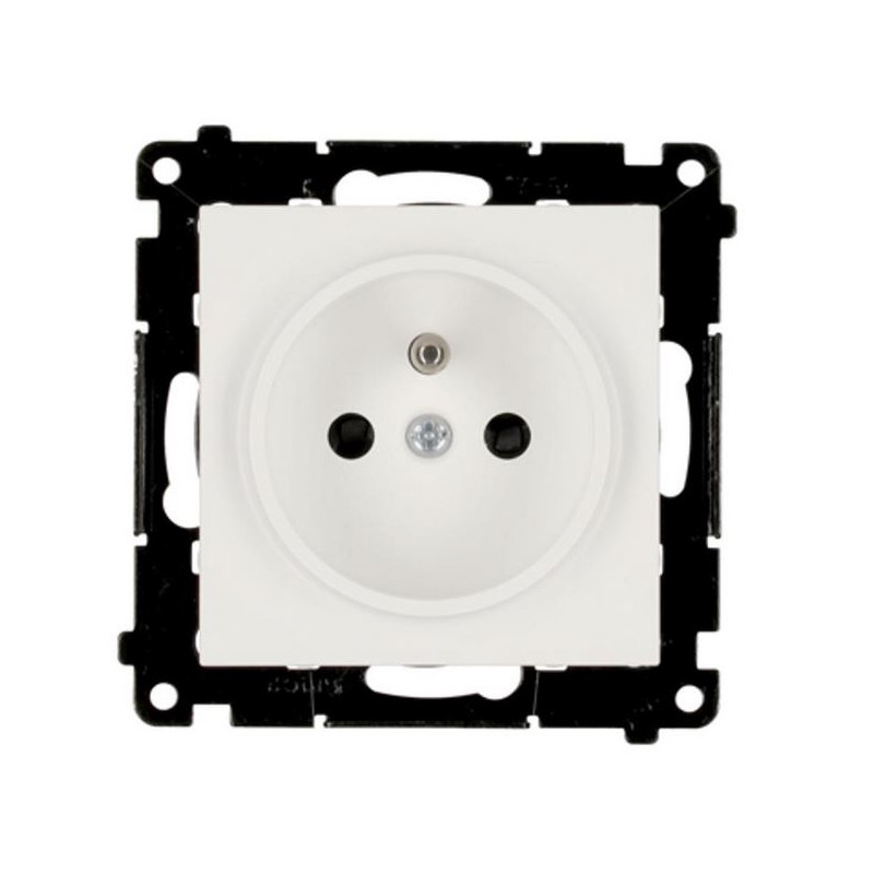 Produkt został wyposażony w przesłony torów prądowych, które ograniczają dostęp do styków i zwiększają poziom ochrony — szczególnie w pomieszczeniach użytkowanych przez dzieci. Model z bolcem uziemiającym zapewnia dodatkową ochronę przeciwporażeniową i pełną zgodność z polskimi normami instalacyjnymi. Gniazdo nie posiada nadruku ani podświetlenia, co podkreśla jego prostą, minimalistyczną formę.