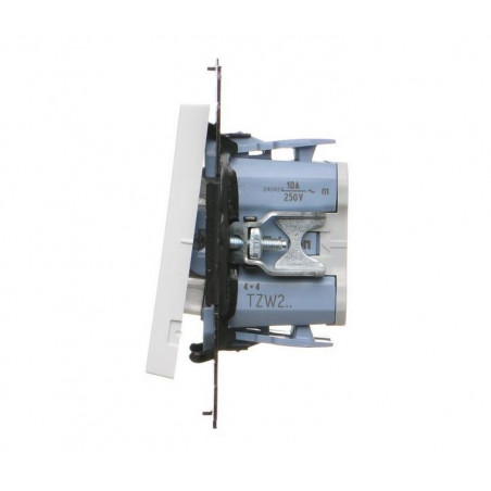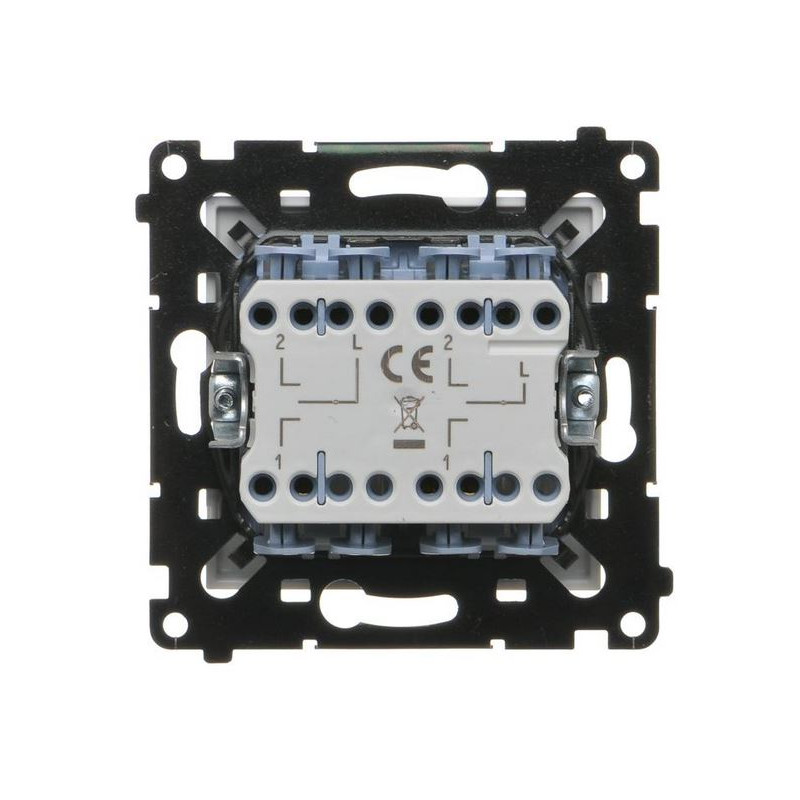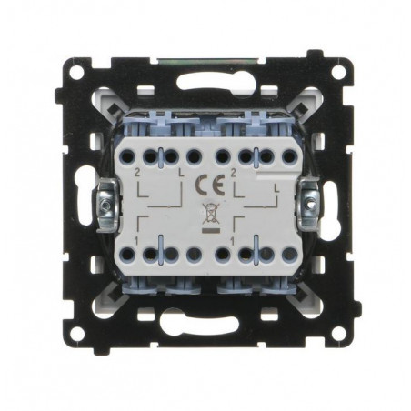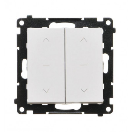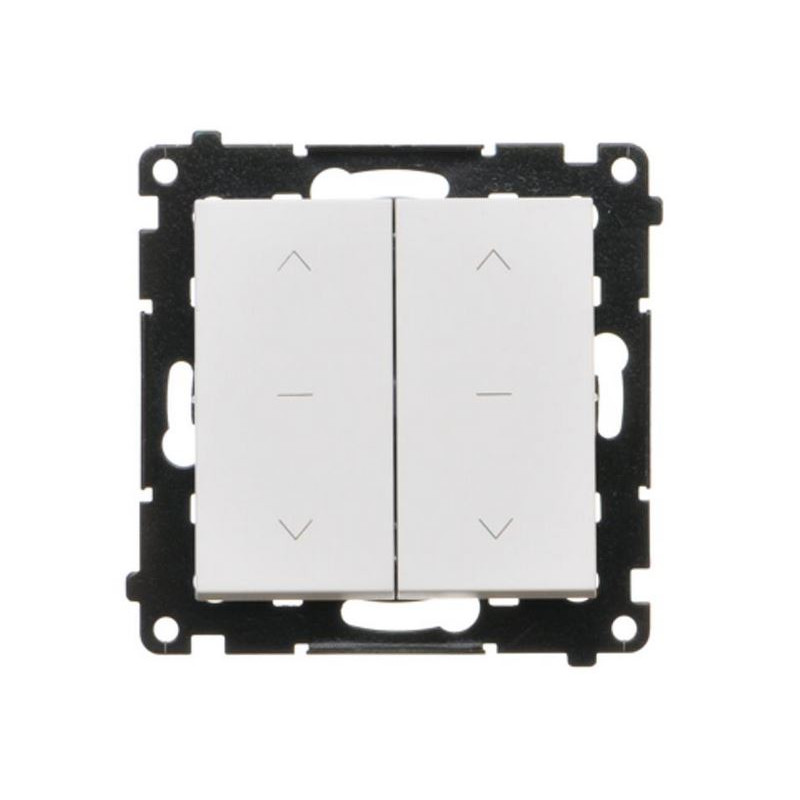 Produkt wyposażony jest w dwa klawisze kołyskowe, które umożliwiają niezależne sterowanie dwoma napędami. Brak podświetlenia sprawia, że urządzenie nie emituje światła, co jest zaletą w sypialniach i pomieszczeniach o niskim natężeniu światła. Symboliczne oznaczenia „żaluzje podwójne” oraz „prędkość obrotowa” ułatwiają codzienne użytkowanie.