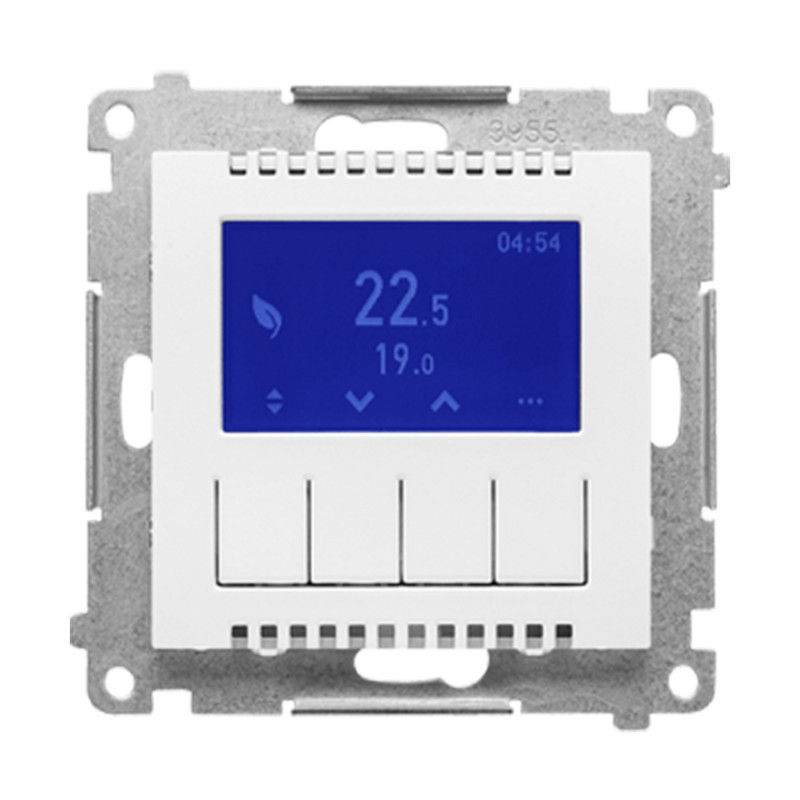 Regulator temperatury Simon 55 z wyświetlaczem to nowoczesne urządzenie umożliwiające komfortowe zarządzanie ogrzewaniem. Dzięki wbudowanemu czujnikowi wewnętrznemu oraz możliwości podłączenia sondy zewnętrznej zapewnia precyzyjne pomiary temperatury. Intuicyjny wyświetlacz LCD z regulowaną jasnością i kontrastem ułatwia obsługę nawet w trudnych warunkach oświetleniowych.