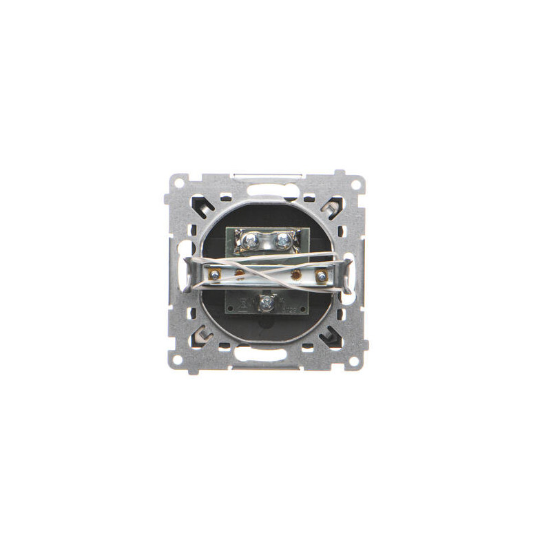 Stopień ochrony IP20 oznacza, że gniazdo jest chronione przed ciałami stałymi większymi niż 12 mm, ale nie jest odporne na działanie wody, dlatego powinno być montowane w suchych miejscach. Materiał użyty do produkcji gniazda to tworzywo sztuczne PC, które jest bezhalogenowe, co zwiększa bezpieczeństwo użytkowania w przypadku pożaru, ponieważ materiał nie emituje szkodliwych gazów. Zabezpieczenie powierzchni gniazda polega na lakierowaniu, co zapewnia dodatkową trwałość i estetyczny wygląd, natomiast wykończenie powierzchni jest matowe, co dodaje elegancji i nowoczesności. Sposób mocowania gniazda realizowany jest za pomocą pazurków i wkrętów, co gwarantuje stabilne i pewne osadzenie w puszce instalacyjnej.