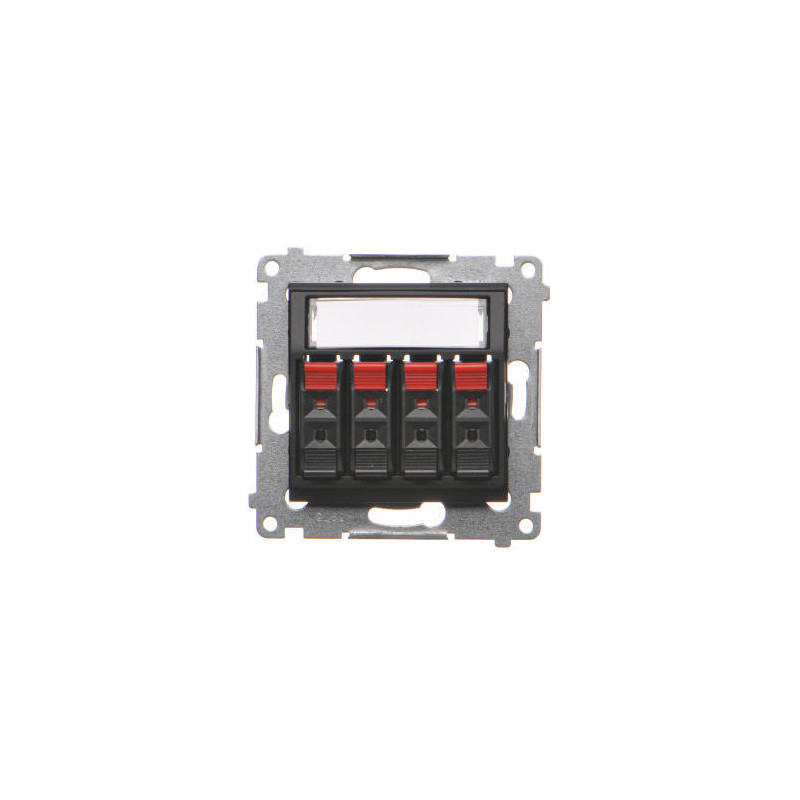 Simon54 Gniazdo głośnikowe 4-krotne DGL34.01/49 czarne to zaawansowane rozwiązanie przeznaczone dla entuzjastów audio i profesjonalnych instalacji audio. To gniazdo głośnikowe w kolorze czarnym macie oferuje elegancki i nowoczesny wygląd, który doskonale komponuje się z innymi elementami wyposażenia wnętrz. Gniazdo przeznaczone jest do podłączenia czterech kolumn głośnikowych, co czyni je idealnym rozwiązaniem dla systemów audio, które wymagają rozdzielenia sygnału do kilku głośników jednocześnie. Rodzaj podłączenia to zacisk kleszczowy, który zapewnia pewne i solidne połączenie z przewodami, umożliwiając ich łatwe zagniatanie. Przekrój przewodów dla wejścia i wyjścia wynosi 2,5 mm², co zapewnia odpowiednią moc i jakość sygnału audio.