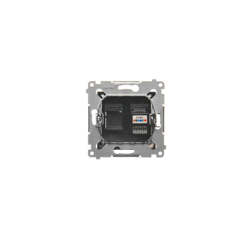 Kolor gniazda to czarny mat, co nadaje mu nowoczesny i subtelny charakter. Wykończenie powierzchni jest matowe, co zmniejsza odblaski i odciski palców, zachowując estetyczny wygląd nawet po dłuższym użytkowaniu. Zabezpieczenie powierzchni odbywa się poprzez lakierowanie, co zapewnia dodatkową ochronę przed uszkodzeniami mechanicznymi i chemicznymi. Zacisk przebijający izolację, co zapewnia szybkie i pewne połączenie przewodów bez potrzeby dodatkowych narzędzi. Gniazdo jest dostosowane do standardu RJ12, co umożliwia podłączenie różnych urządzeń telekomunikacyjnych, takich jak telefony stacjonarne czy faxy. Stopień ochrony IP20 oznacza, że gniazdo jest przeznaczone do użytku w suchych pomieszczeniach i nie jest odporne na działanie wody.