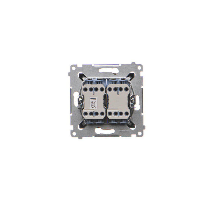 Łącznik został wykonany z wysokiej jakości tworzywa sztucznego, które jest nie tylko trwałe, ale także bezhalogenowe, co oznacza, że w przypadku ewentualnego pożaru nie emituje ono szkodliwych dla zdrowia substancji, takich jak toksyczne gazy. To istotna cecha, która podnosi poziom bezpieczeństwa użytkowników i sprawia, że produkt ten spełnia rygorystyczne normy bezpieczeństwa. Dodatkowo, zewnętrzna powierzchnia łącznika została poddana procesowi lakierowania, co nie tylko chroni przed zarysowaniami i innymi uszkodzeniami mechanicznymi, ale również nadaje mu elegancki, matowy wygląd, który doskonale wpisuje się w nowoczesne wnętrza. Pod względem technicznym, łącznik krzyżowy podwójny Simon54 obsługuje prąd znamionowy świetlówkowy o wartości 10 AX oraz napięcie znamionowe 250 V, co czyni go wszechstronnym elementem instalacji oświetleniowych, zarówno w domach, jak i w obiektach komercyjnych. Dzięki szybkozłączom, instalacja łącznika jest szybka i łatwa, eliminując konieczność używania dodatkowych narzędzi, co znacząco skraca czas montażu i minimalizuje ryzyko błędów instalacyjnych. Szybkozłącza to innowacyjne rozwiązanie, które podnosi komfort pracy instalatorów, jednocześnie zapewniając solidne i bezpieczne połączenie przewodów.