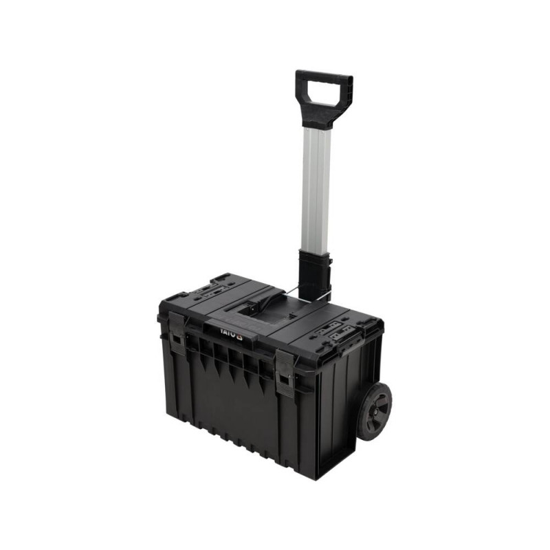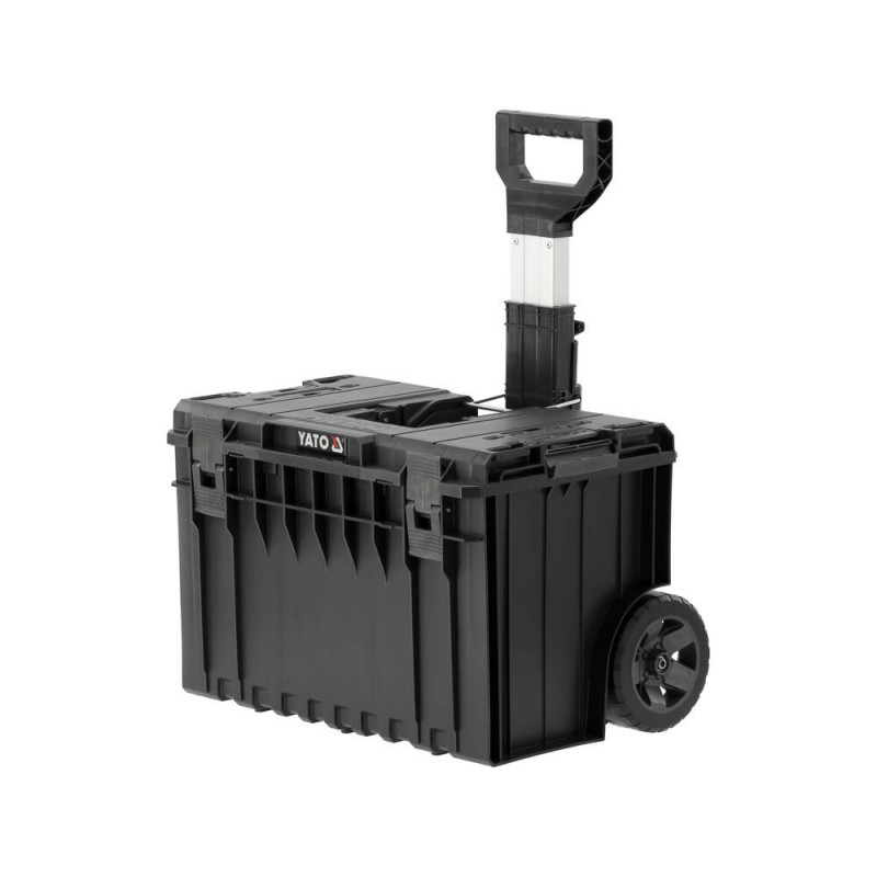 - Teleskopowy, aluminiowy uchwyt oraz 2 koła pokryte gumą zapewniające zwrotność i wygodny transport nawet rozbudowanego zestawu narzędzi.