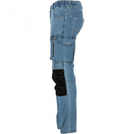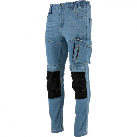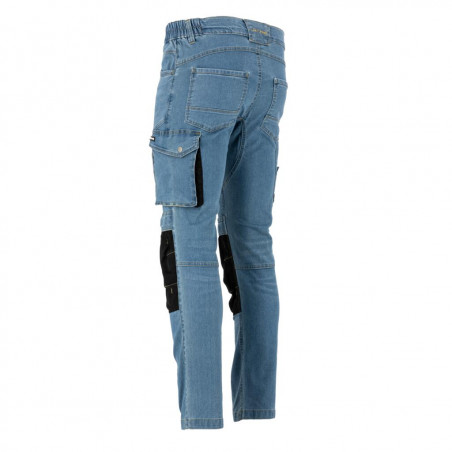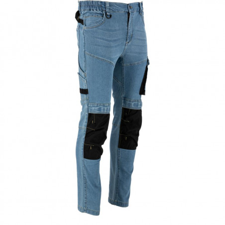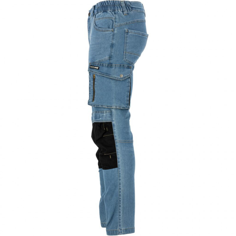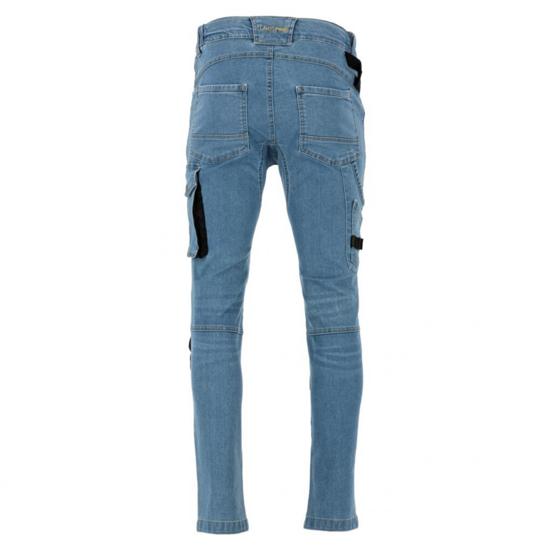 Lahti Pro L40547 to męskie spodnie robocze jeansowe slim fit, łączące wytrzymałość materiału z komfortem noszenia. Wykonane z denimu z dodatkiem stretchu (75% bawełna, 23% poliester, 2% elastan, 320 g/m²), idealnie dopasowują się do sylwetki i zapewniają pełną swobodę ruchów podczas pracy.