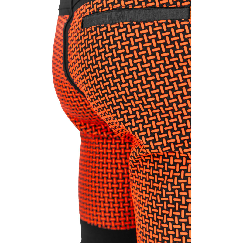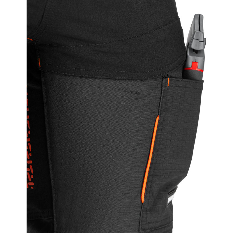 Model L40549 wykonano z dwóch typów materiałów: rip-stop (odporny na przetarcia i uszkodzenia mechaniczne) oraz stretch 4-way elastic, który rozciąga się w czterech kierunkach. Dzięki temu spodnie są niezwykle elastyczne i komfortowe, nawet przy dużym zakresie ruchów. Wzmocnione szwy w kroku oraz tył pokryty gumą antypoślizgową zwiększają trwałość i odporność na uszkodzenia.