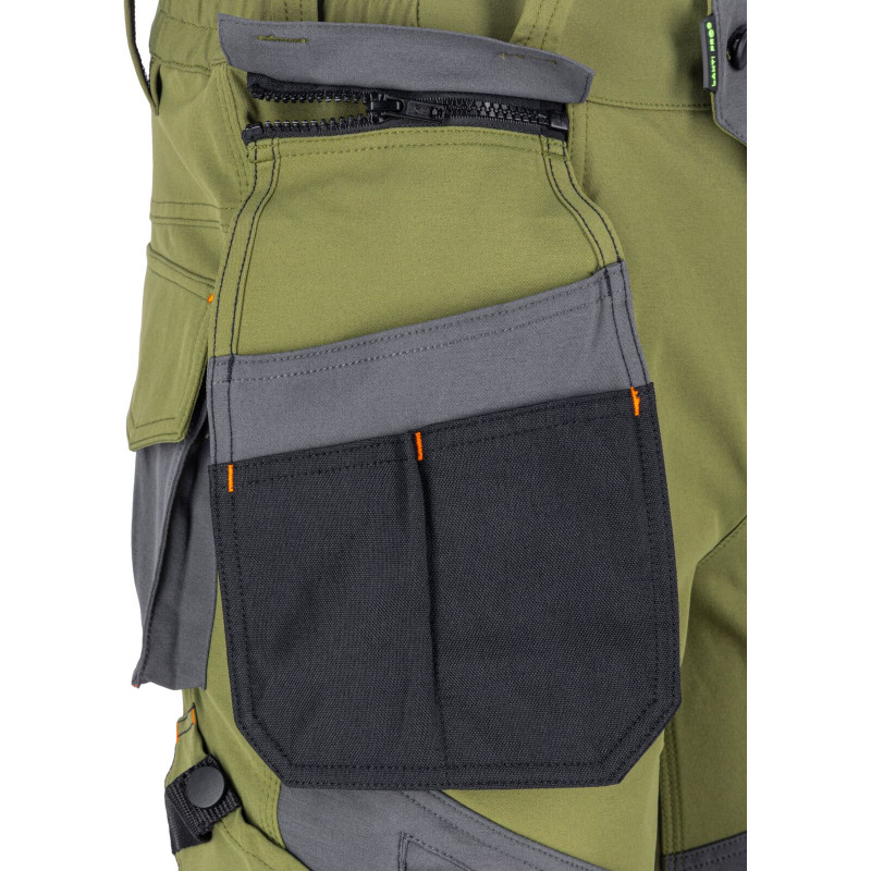 Dodatkowym atutem są odpinane kieszenie monterskie, które zwiększają funkcjonalność spodni i pozwalają dopasować je do aktualnych potrzeb pracy.