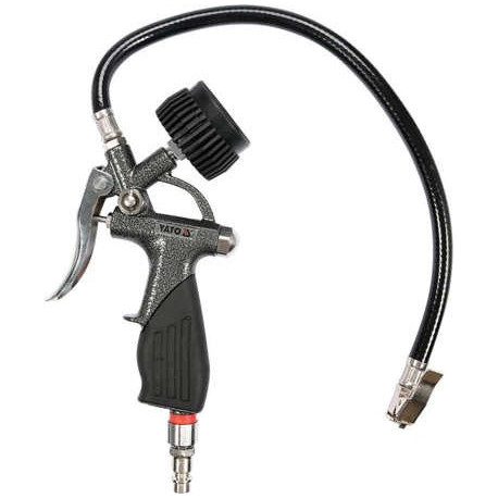 Profesjonalny pistolet marki YATO z manometrem do pompowania kół. Korpus pistoletu pokryty antypoślizgowym materiałem. Manometr zabezpieczony gumowym korpusem. Długość węża 40 cm, max ciśnienie robocze 0,6 Mpa, przyłącze 1/4" osadzono na obrotowym korpusie - zapobiega to plątaniu się węży pneumatycznych. Zastosowanie w serwisach ogumienia, warsztatach naprawczych czy stacjach paliw.