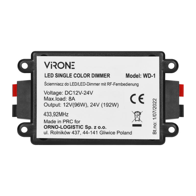Kontroler RF WD-1 marki VIRONE to zaawansowane narzędzie do regulacji intensywności oświetlenia LED, działające w systemie 12-24V DC. Wyposażony w pilot radiowy (RF), umożliwia zdalne sterowanie oświetleniem z dowolnego miejsca, bez konieczności bezpośredniego kontaktu z urządzeniem. To rozwiązanie znacznie podnosi komfort użytkowania, pozwalając na wygodną kontrolę oświetlenia, niezależnie od odległości czy przeszkód, takich jak ściany lub meble. Ściemniacz ten idealnie sprawdzi się w różnorodnych instalacjach LED, w tym w taśmach LED czy innych zestawach oświetleniowych zasilanych napięciem 12V lub 24V. Dzięki regulacji oświetlenia, można dostosować jasność do aktualnych potrzeb – od delikatnego podświetlenia dekoracyjnego po pełne oświetlenie przestrzeni.