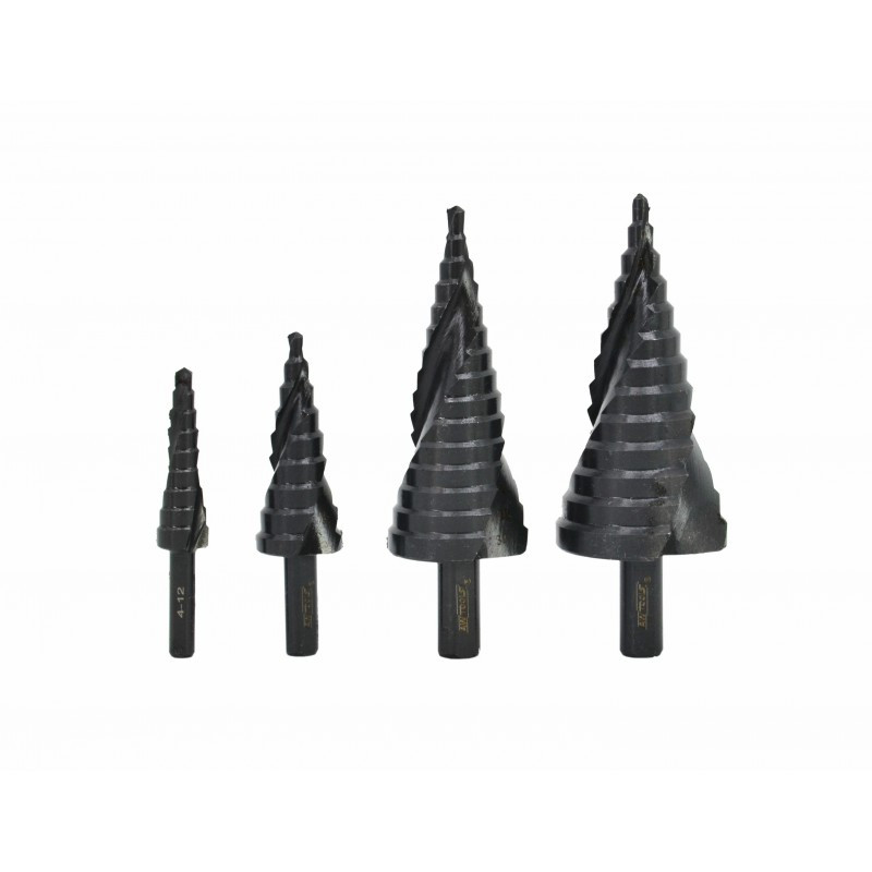 Każde wiertło w tym zestawie ma spiralną budowę, która zapewnia szybszą obróbkę i czystsze cięcie, co jest kluczowe przy pracy z materiałami takimi jak blachy stalowe, metale nieżelazne czy tworzywa sztuczne. Dzięki spiralnej konstrukcji, wiertła efektywnie usuwają wióry z otworu, co minimalizuje ryzyko zatykania się narzędzia i poprawia jakość wiercenia. Zestaw wierteł stopniowych nie wymaga nawiercania wstępnego, co znacząco przyspiesza i upraszcza proces wiercenia. Laserowo wycięta numeracja na powierzchni wierteł pozwala na precyzyjne kontrolowanie wielkości otworu podczas wiercenia, co zwiększa dokładność i wygodę użytkowania.