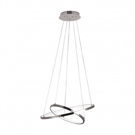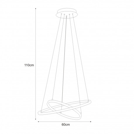 Lampa składa się z 2 pierścieni największy o średnicy 60cm, przymocowanych do podstawy na cienkich, regulowanych żyłkach. Do budowy dolnych elementów lampy wykorzystano tworzywo sztuczne najwyższej jakości, które jest odporne na nagrzewanie, natomiast podsufitka jest wykonana z trwałego metalu. Pierścienie z zewnątrz są w modnym kolorze chrom. Idealnie nada się do wnętrz współczesnych, minimalistycznych oraz do loftów i na duże sale wystawowe. Doskonale dopełni aranżacje pomieszczeń, gdzie występują już inne srebrne dodatki. Położenie obręczy w każdej chwili można dowolnie zmieniać, regulować tworząc za każdym razem inny układ. Całkowita regulowana wysokość lampy wynosi maksymalnie 110 cm.