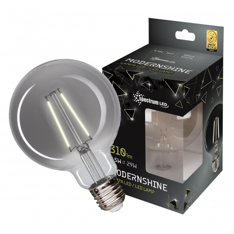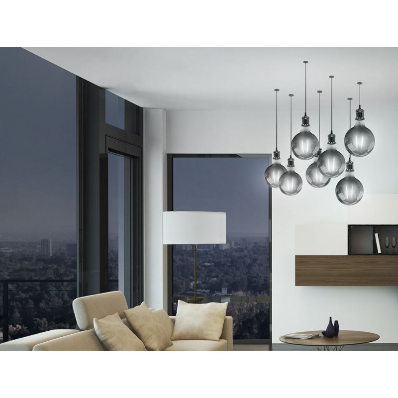 Wyjątkowy i niespotykany design dekoracyjnej serii MODERNSHINE, z efektem czarnego opalizującego i 'przydymionego szkła' zapewnia kameralną atmosferę i nastrojowe oświetlenie. Jest jeszcze bardziej energooszczędne dzięki zastosowaniu trwałych filamentów COG, które zużywają bardzo mało energii elektrycznej.